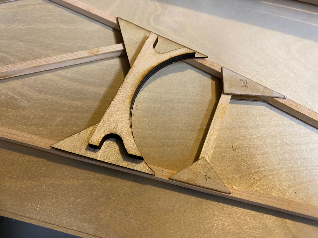 With the nose rib, I cut a K-Block on the CNC. The plus of the laser is that you don't have to do any fixation for the pieces to cut. The big downside is you have to sand all the glue faces; otherwise, you may get into severe trouble later.